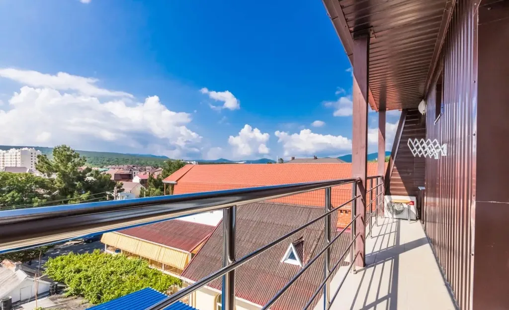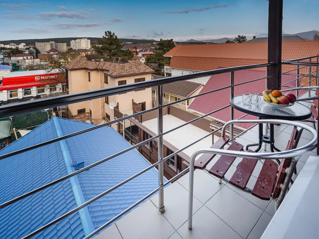 Месторасположение отличное, прямо напротив Магнит и вкусное кафе. До моря минут 10 идти. Номер хороший, с балконом и видом на горы. На территории отеля есть детская площадка.